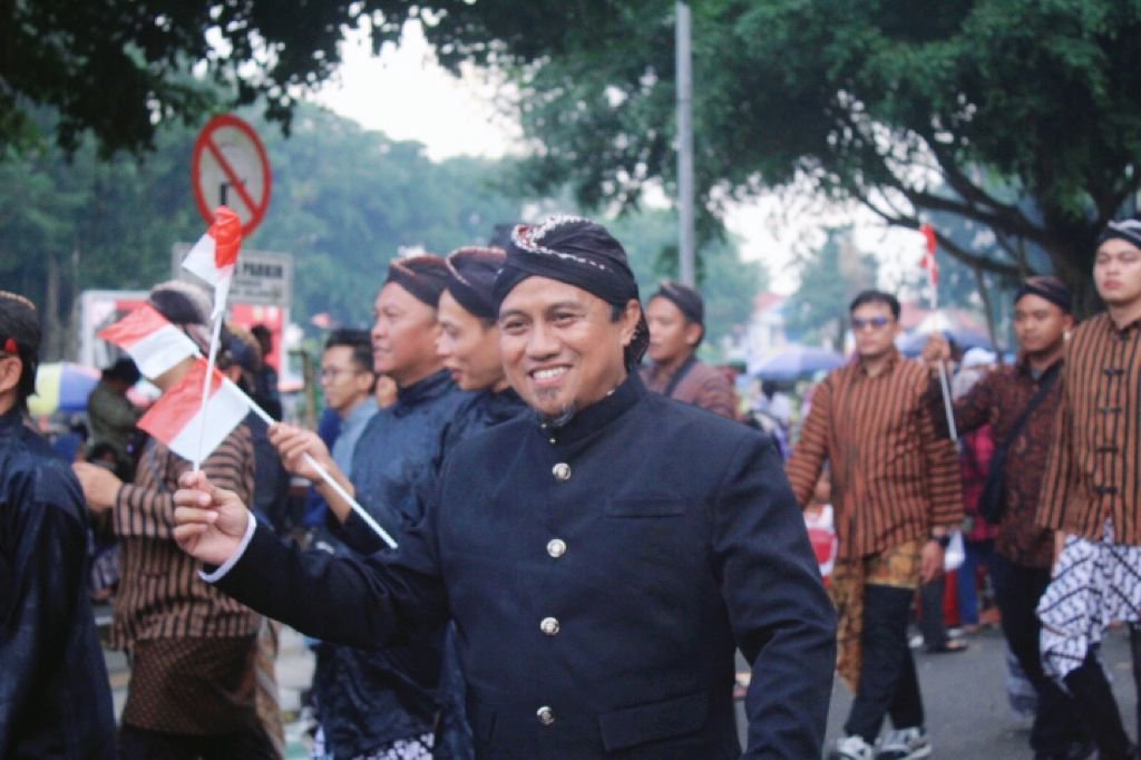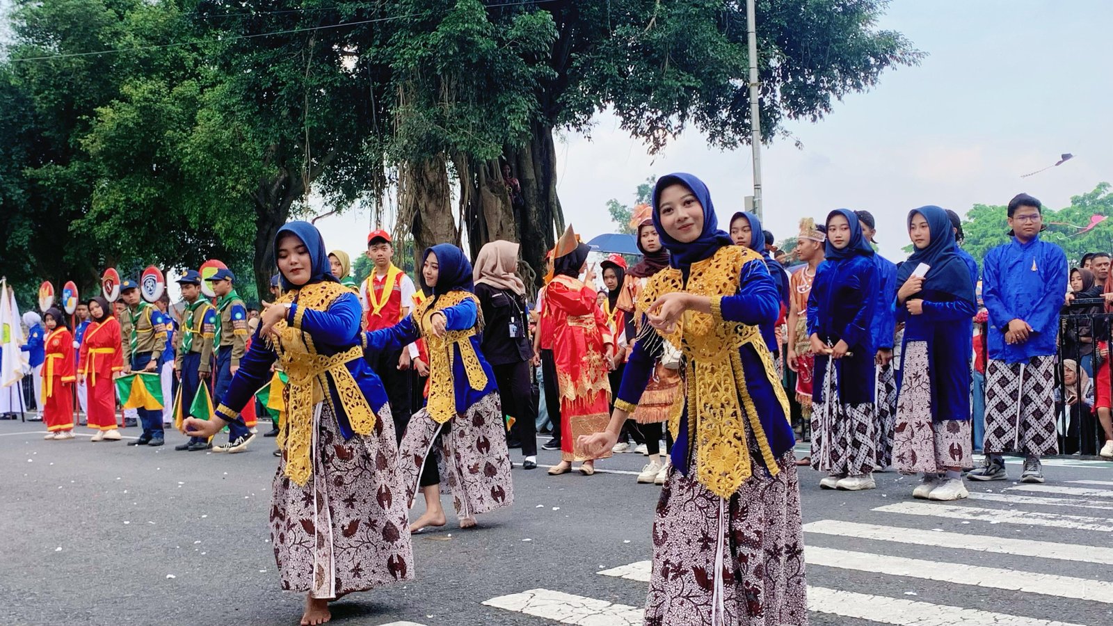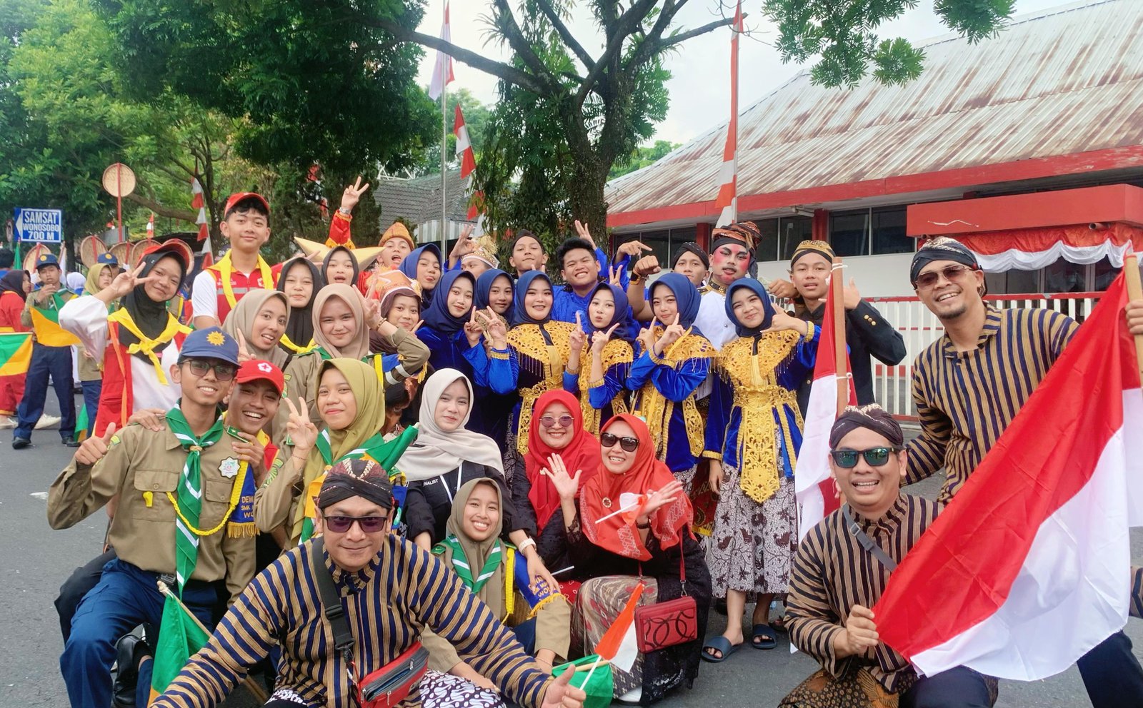 Barisan guru dan karyawan SMK Mutu juga ikut serta dengan penuh wibawa. Para bapak tampil gagah mengenakan baju Kokam dan pakaian adat Jawa, sementara para ibu tampak anggun dengan kebaya hitam dan kerudung merah bendera yang melambangkan semangat kemerdekaan.