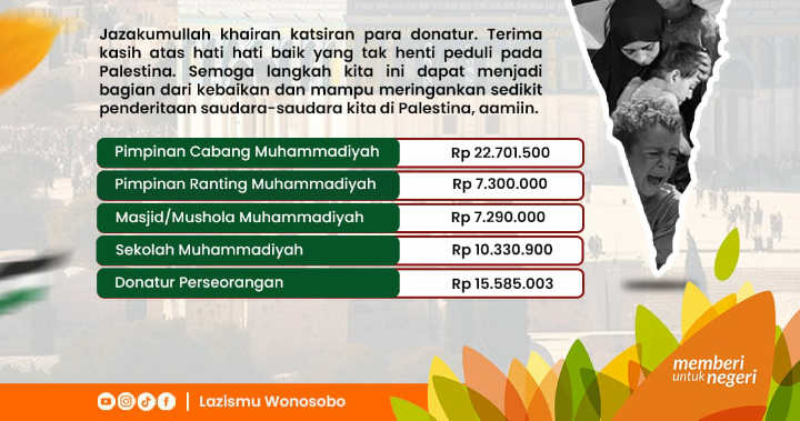 MUHAMMADIYAHWONOSOBO.COM – Kepedulian masyarakat Wonosobo terhadap krisis kemanusiaan di Palestina kembali terbukti. Hingga 7 Oktober 2025, total dana yang berhasil dihimpun oleh Lazismu Wonosobo mencapai Rp 63.207.403.